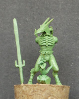 Use whatever sized slotta base its been designed for for the next step,these are desting for 25mm round.So i take a 25mm round base thats superglued onto a cork and first cut away the putty to the left and righ of the tab.Test fit into the base now and remove putty from the bottom of the tab until the feet rest perfectly on top of the base.Once you're happy with this very carefully trim away any excess putty that is still there between the feet.